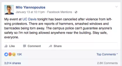 After the cancellation, Yiannopoulos said in a Facebook post: