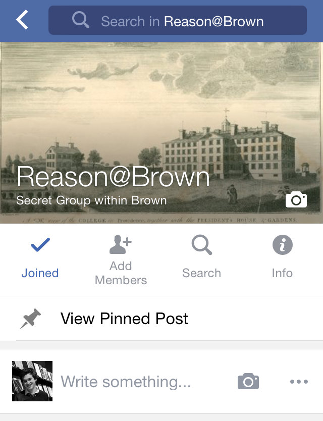 And that, to me, was so profoundly illiberal and antithetical to the mission and ethos of the university, and the United States of America as a whole, that I decided to do something about it. And I started your standard, secret Facebook group. I called it Reason@Brown. I invited maybe five people; I wrote a post in it announcing that the purpose was for discussions about any and every topic, including and especially ones that people would not be able to have in public for fear of social censure and complete lack of support from the administration in the event of students breaking the rules.