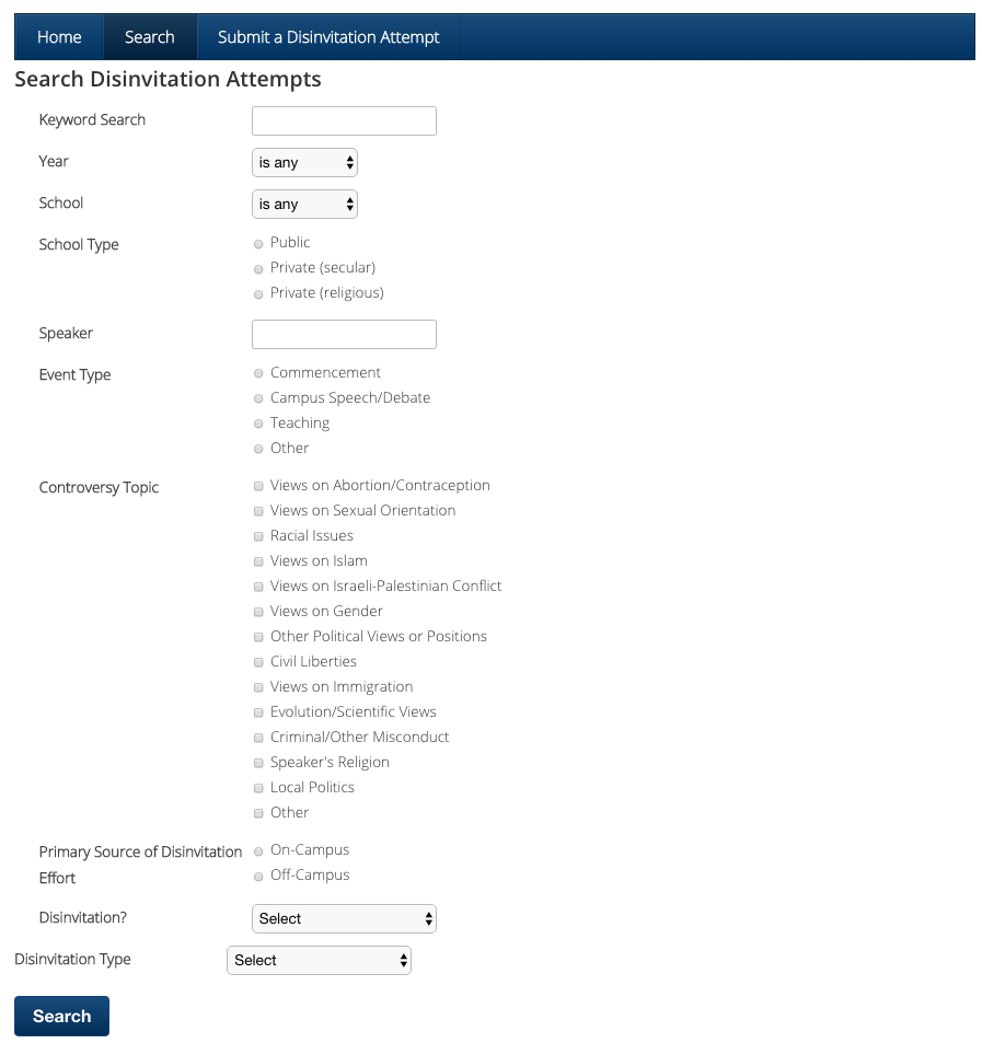 If you are aware of a disinvitation incident that is not on our list, please let us know! To submit a new incident, click on the “Submit a Disinvitation Attempt” button in the blue bar at the top of the database, and then click on the link to send us an email.