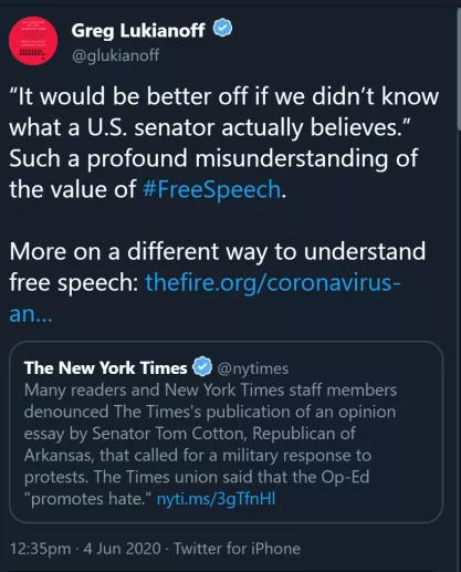 The primary argument seems to go like this: Because The New York Times is under no obligation to publish something by Sen. Cotton, they shouldn’t have done so.
