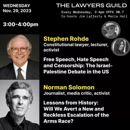 On Nov. 29th, from 3-4 pm PST on KPFK 90.7 FM, there will be a program with Constitutional law expert Stephen Rohde on the topics of free speech, hate speech, and censorship surrounding the Israel-Palestine debate in the US.