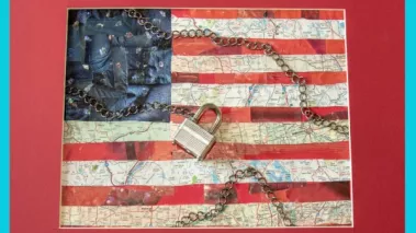 “It took me a few weeks to create and went through several incarnations before I settled on the final design,” she said. “I spotted a stack of maps in our art supply room and was immediately attracted to the idea of overlaying that on a flag design, but I also wanted to counter that with something to create a sense of tension. I considered jail bars or handcuffs but settled on the idea of a chain and lock.”