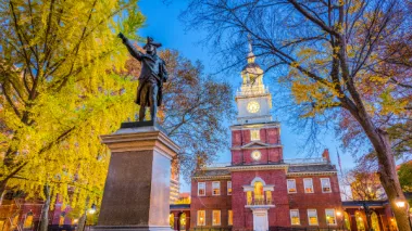 Commodore Barry, father of America's Navy, points to FIRE's offices, located directly across from Independence Square Park.