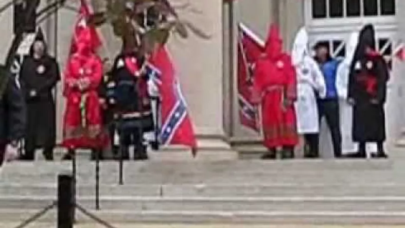 In the video, a small group of Klansmen stand in the doorway of a campus building as a large groups of students and members of the campus community gather to observe and challenge them.