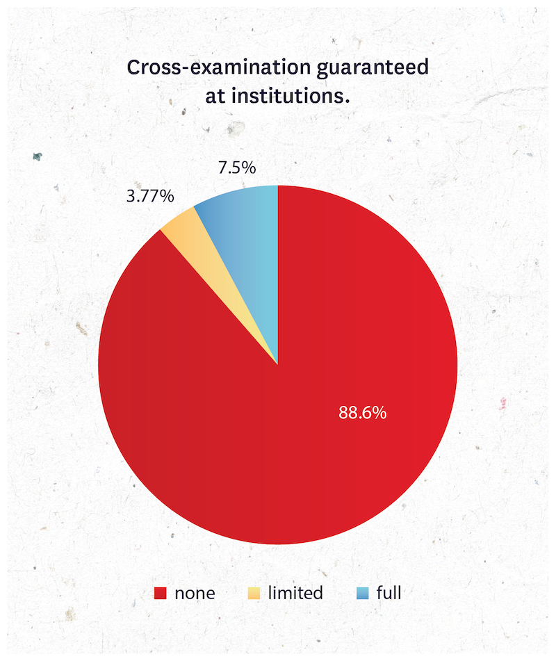 Yet 38 institutions (76%) do not provide students a meaningful opportunity to cross-examine witnesses in cases of non-Title IX sexual misconduct. Only four institutions (7.5%) provide an opportunity for cross-examination in all non-academic cases and clear guidelines that ensure all relevant questions are relayed to the party being questioned.
